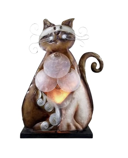 – Hand-painted metal and elegantly painted lamp of a cute lazy cat. 11″ tall x 3″ wide x 7″. All Lamps are mounted on a base that coordinates with the lamp theme.