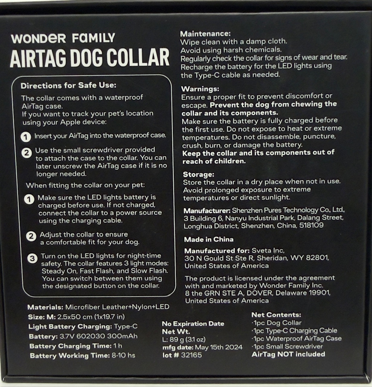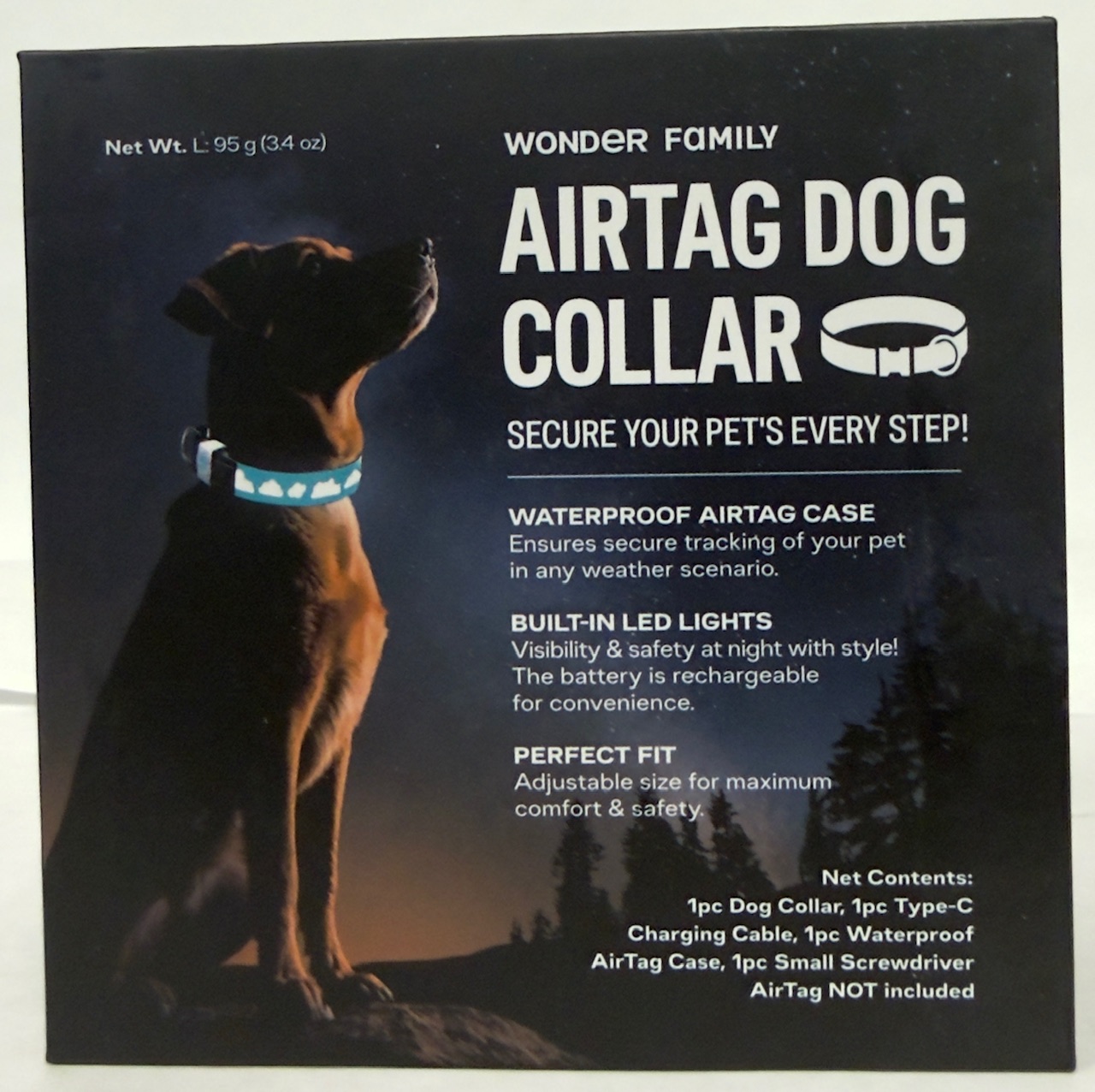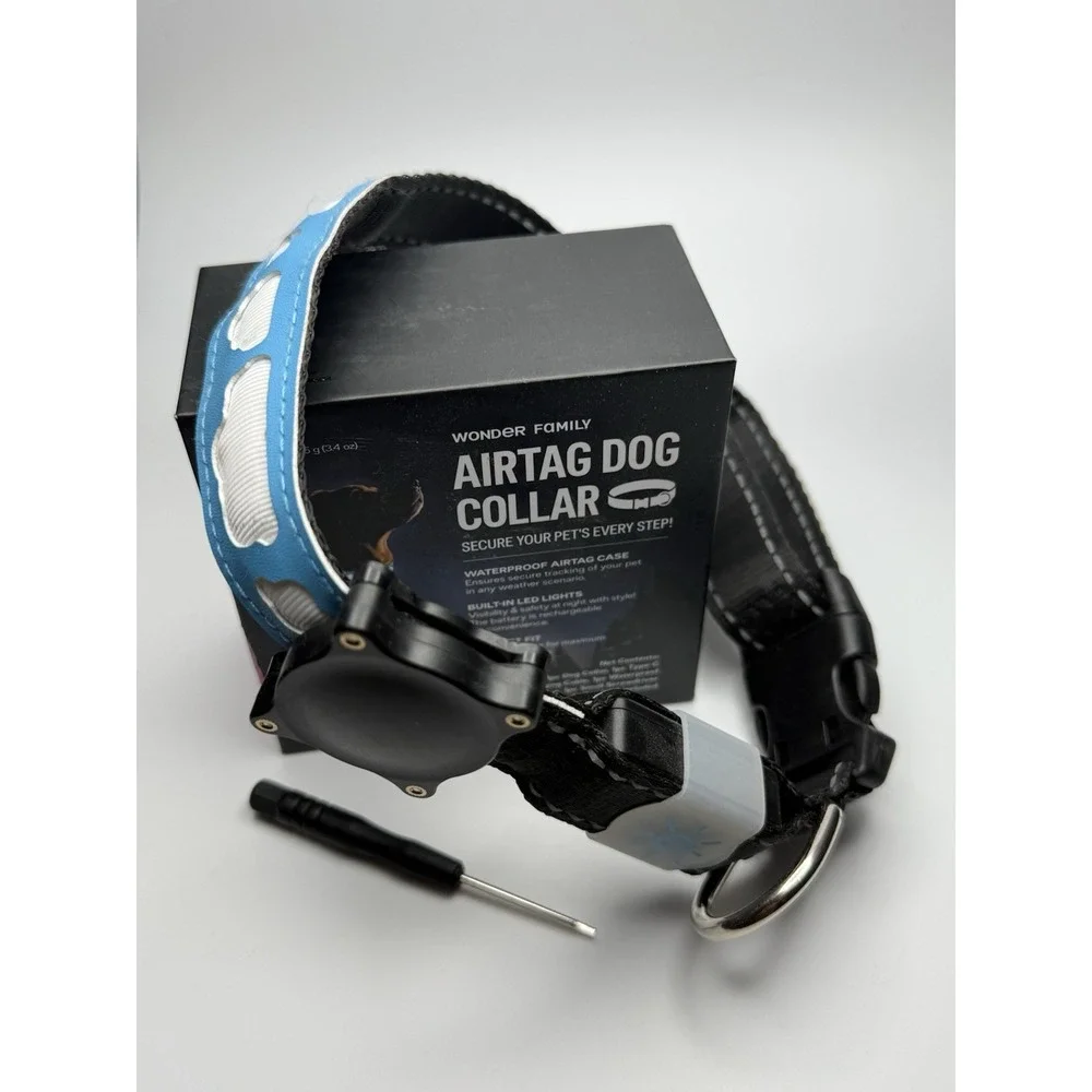 Contents: 1 Dog Collar, 1 Type C Charging Cable, 1 Waterproof Air Tag Case, 1 Small Screwdriver