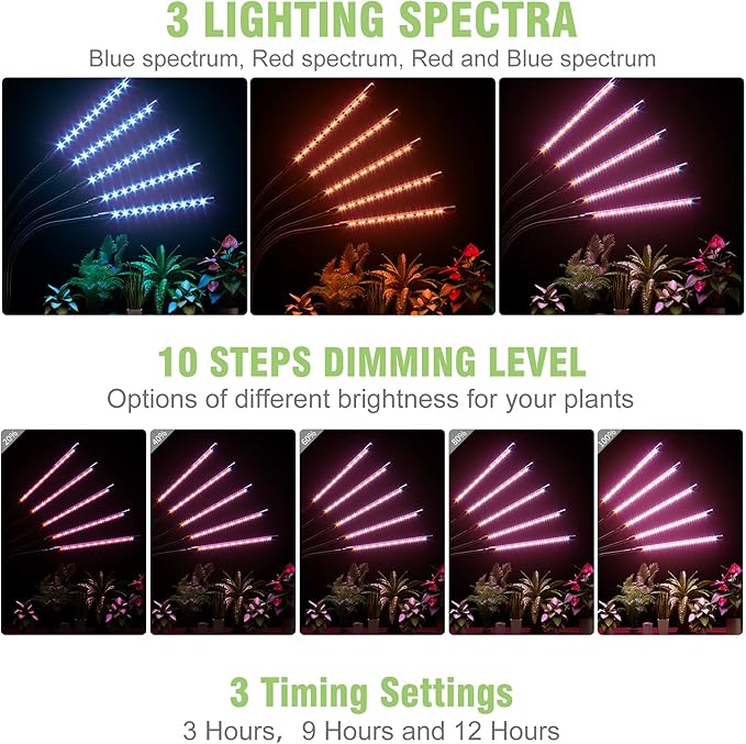- 3 Spectral Modes & 10 Brightness Levels: Full spectrum led grow light has 3 spectrum modes(Red, Blue & Mixed Spectrum). 10 brightness settings ranging from 10% to 100%, we can be switched at will, free to choose the most suitable brightness and spectrum for our plant growth. Makes plants grow 5 times faster than natural plants.