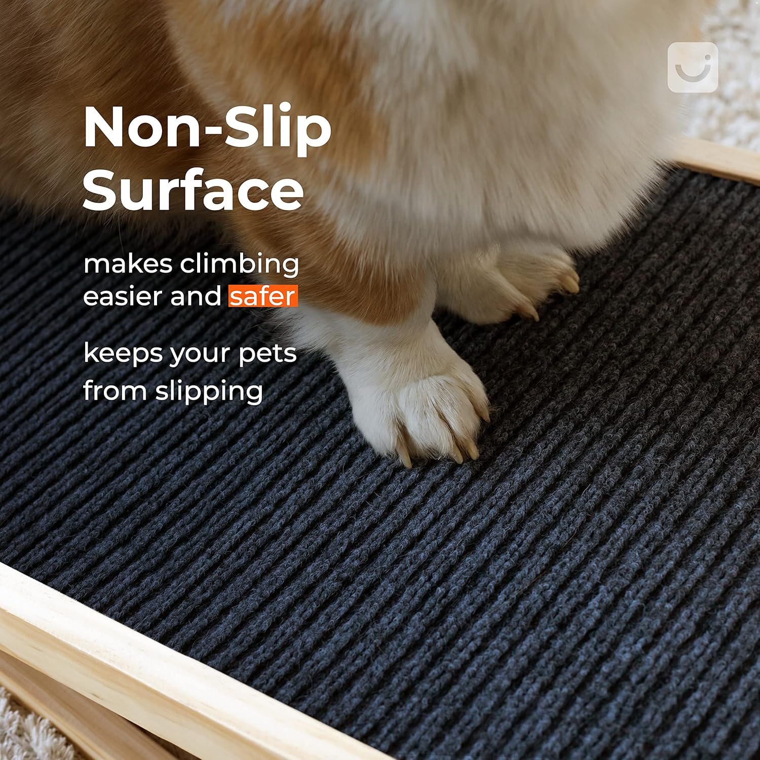- ANTI-SKID SURFACE – The specialized material of this adjustable dog ramp increases surface friction and prevents slipping. Your furry friend can confidently climb up and down without worry. Besides that, the surface of this pet ramp is thoughtfully designed to be gentle on your pet’s paws, preventing any abrasions or discomfort during use.