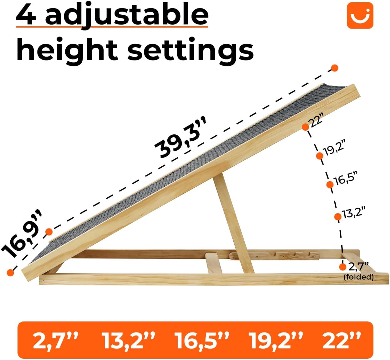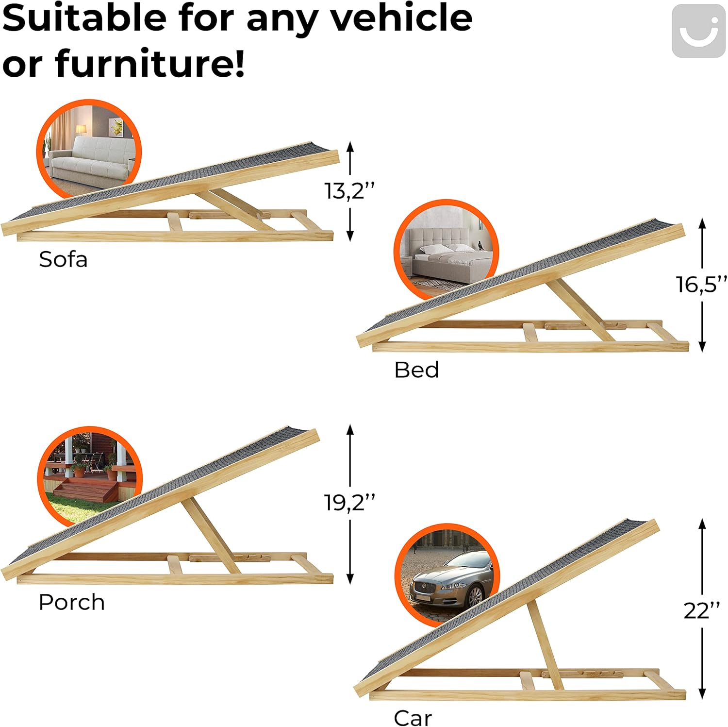 - This wood dog ramp has 4 heights, so you can put it anywhere. No matter how high your car, bed, or couch is.
