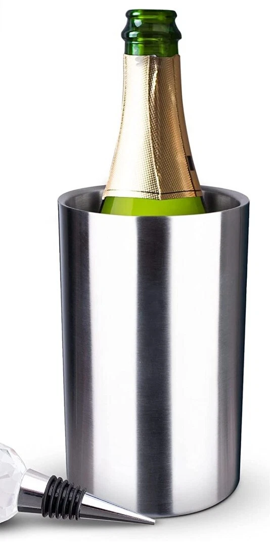 - 𝗞𝗲𝗲𝗽𝘀 𝗪𝗶𝗻𝗲 & 𝗖𝗵𝗮𝗺𝗽𝗮𝗴𝗻𝗲 𝗖𝗵𝗶𝗹𝗹 & 𝗙𝗿𝗲𝘀𝗵: Place your pre-chilled bottle in the white wine and champagne bucket, keeping your drink 50oF (10oC) cooler lasting you between 2-4 hours. Long enough to watch a short movie or entertain your guest over a home dinner party, till the last glass. The double wall insulation prevents your favorite drink from becoming warm too quickly. The bonus crystal wine bottle stopper keeps your wine and champagne fresh too!