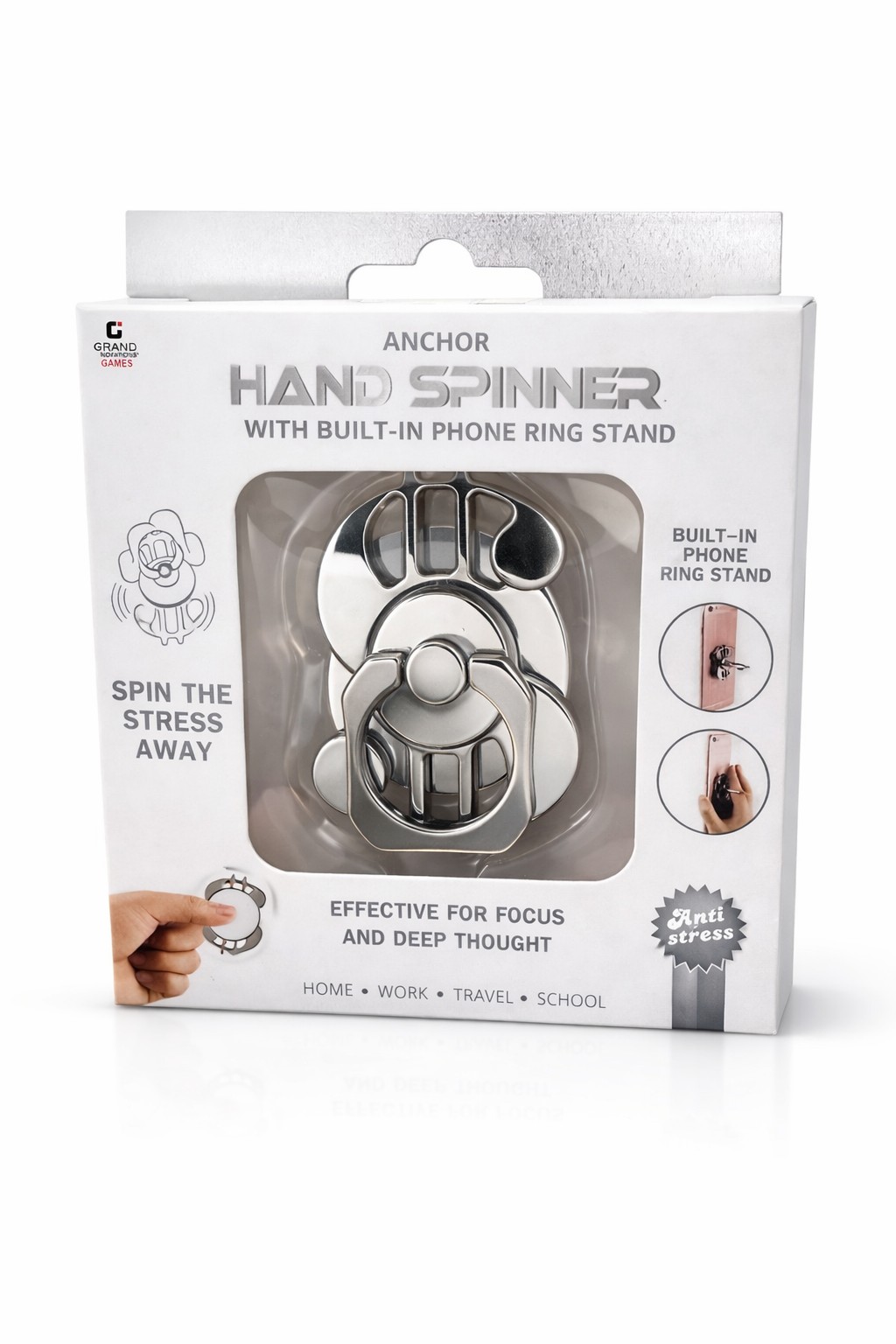 - Metal hand spinner with built-in phone ring stand
