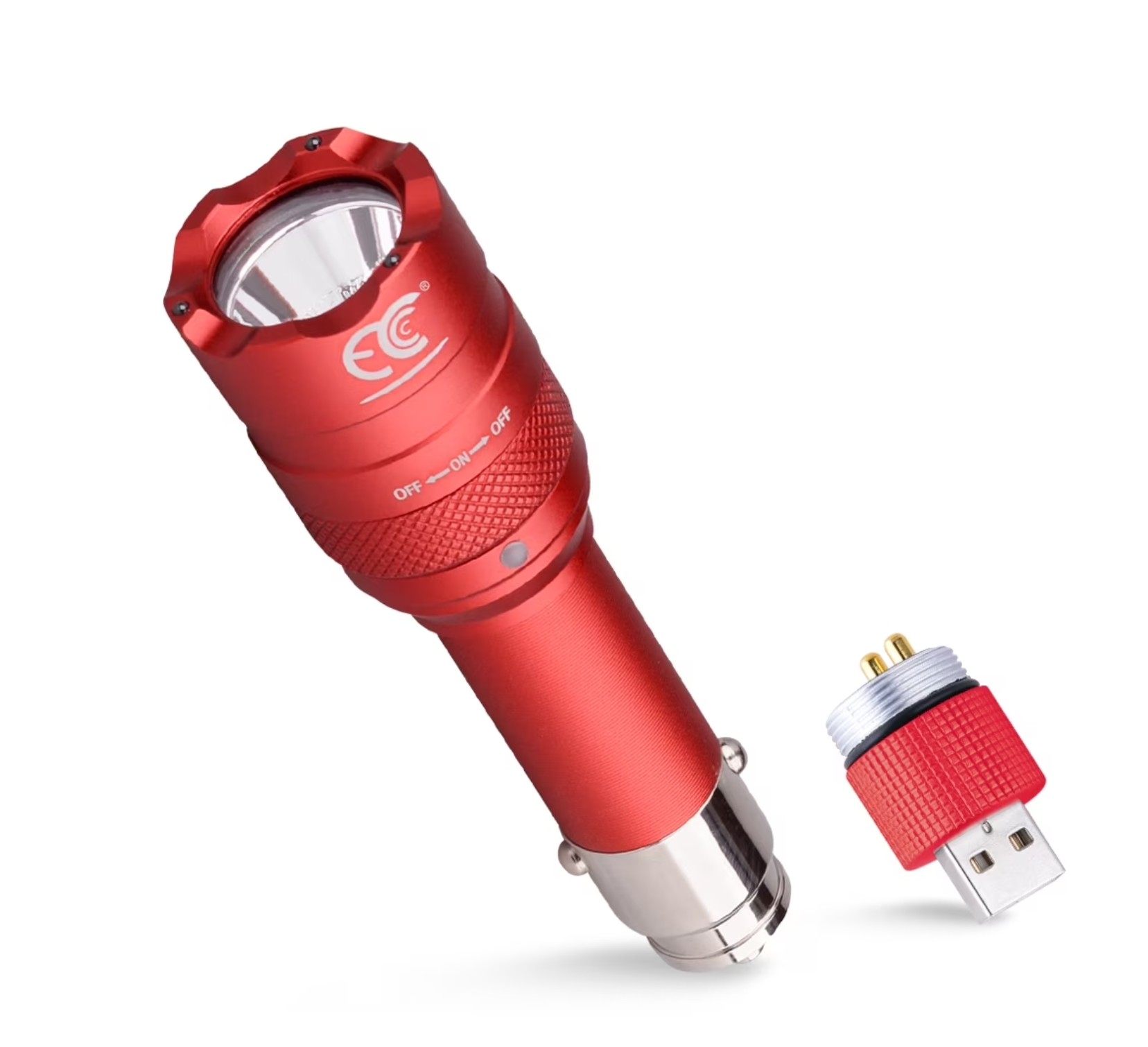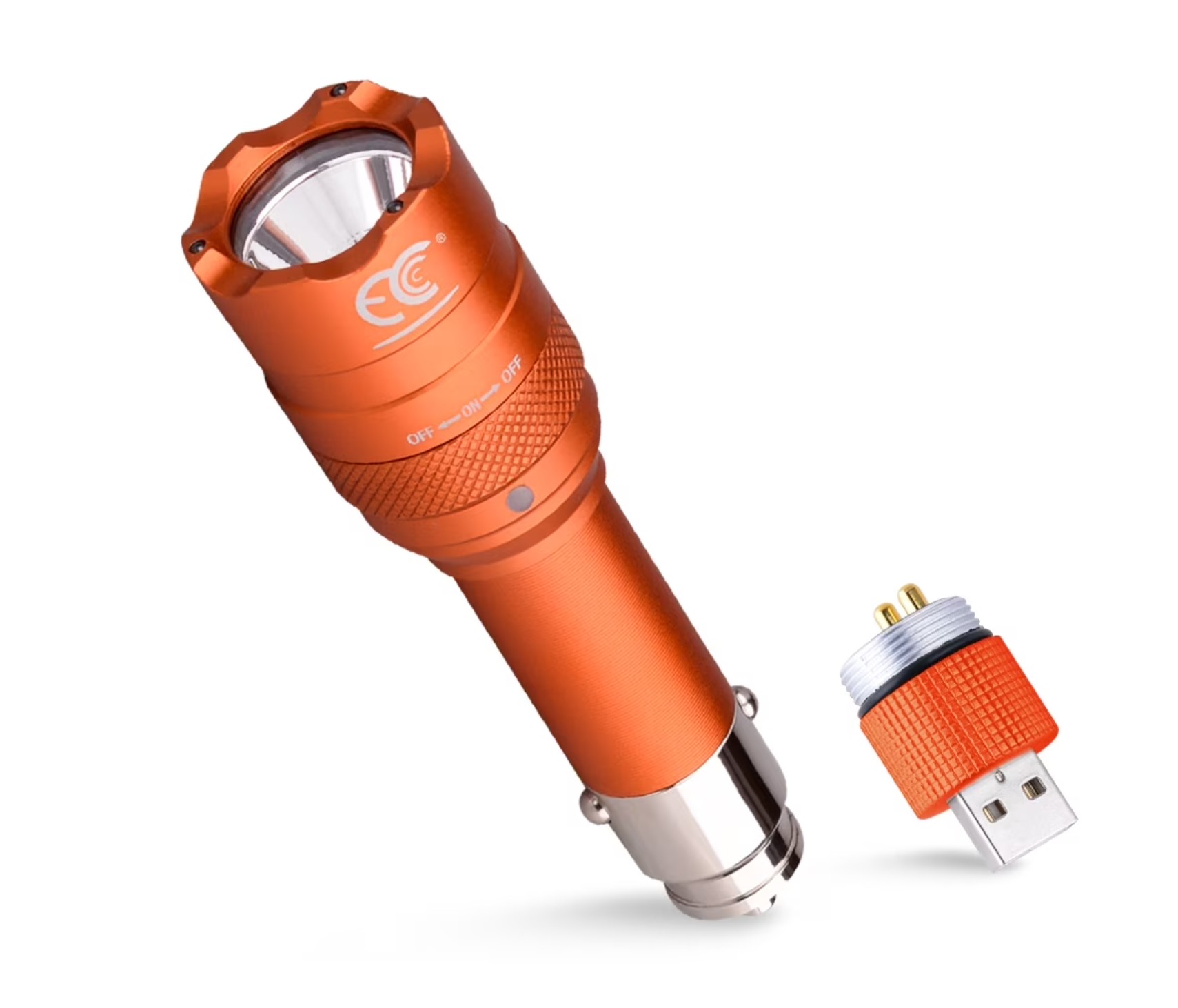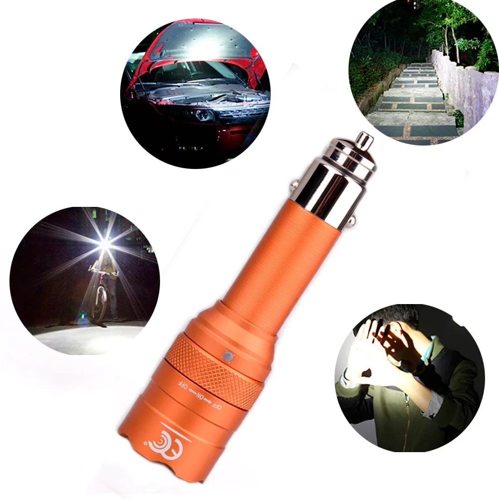 Metal LED Rechargeable Flashlight – Cigarette Lighter and/or USB Charger – Orange & Red – Item #8840