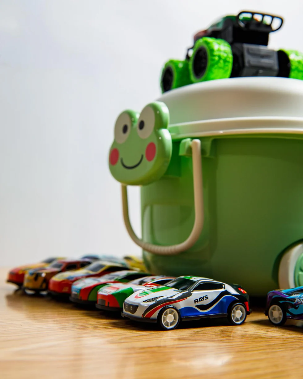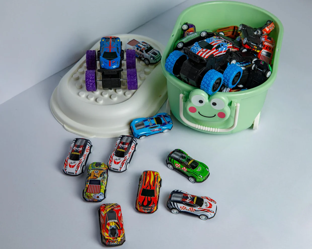 Mini Pull Back Cars/Vehicles and Bonus Big Monster Trucks – Frog Storage Case Included – Item #8837