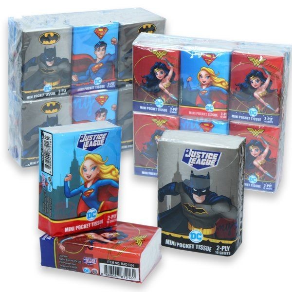 Pack of 12 – DC Justice League Pocket Tissues – 10 Sheets – 2 Ply – 2 Assorted Styles – Item #8307