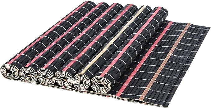 Set of 6 placemats for tables made of natural painted bamboo is a stylish decoration for Your table. It is neat and easy to clean table accessory. In order to clean shake them over the bin first, then if needed use a wet wipe and it gets rid of everything. Perfect tabletop PROTECTION from heat and scratches. Easy wipe clean, nice smell, durable, keeps shape. Rolled up for easy storage, compact when folded. Material: Painted bamboo.