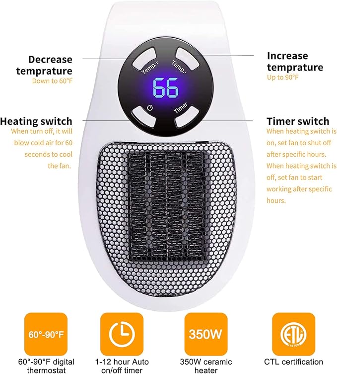 - With led display and timer-Plug in Heater: Press the ” Timer ” button allows you to scroll through 1 and 12 hours in 1 hour increments. For auto power on timer, ensure the heater is turned off, press the ” Timer ” button until the led display shows the number of hours you want. For auto shut off timer, ensure the heater is turned on, keep pressing the ” Timer ” button till it reach your desire time.