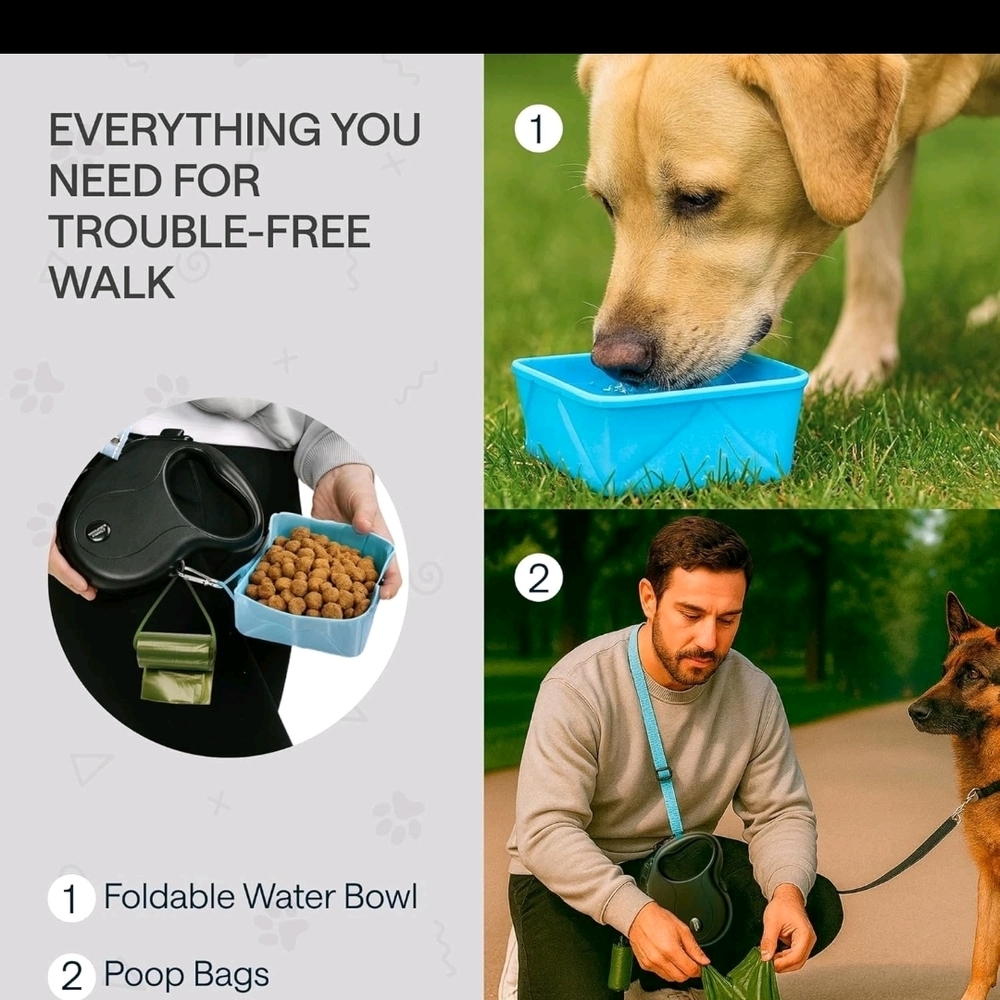 - DOG WALKING KIT INCLUDED: Comes with foldable travel bowl, poop bags, and D-ring attachment. Designed for dog parents who value function and convenience. Use this retractable leash as a travel companion or everyday dog lead. Versatile enough for training, walking, or off-leash simulations.