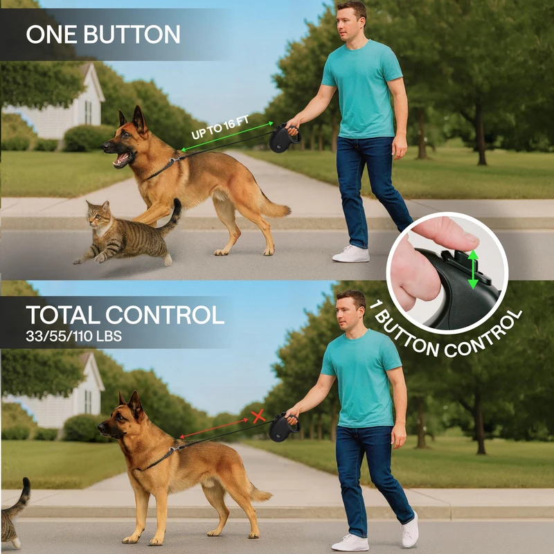 - NO PULL, TANGLE-FREE MECHANISM: Heavy duty retractable leash with smooth brake, pause, and lock system. Designed as a no pull dog leash for dogs that tend to lunge or react. Prevents tangling during turns or sudden stops. Excellent as a training leash for dogs that pull. Control dogs confidently in parks, trails, or busy streets. No more twisted lines or panic stops during walks.