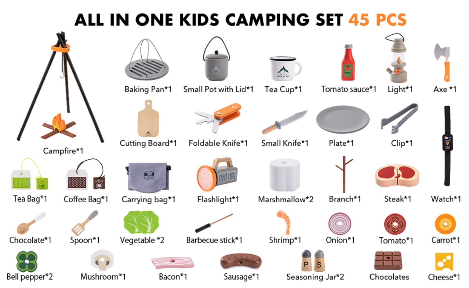 - 45PCS Rich Camping Toys for Kids: ROBOTIME kids camping toy with fire include 1 mat storage bag, 1 toy campfire, 1 campfire stand, 1 cap, 1 cap lid, 1 watch, 1 2-in-1 flashlight lantern, 1 chopping board, 1 knife, 1 foldable fork knife, 1 utensil kit, 1 lantern, and 11 foods. The rich accessories will give your little camper a real experience and endless camping fun.