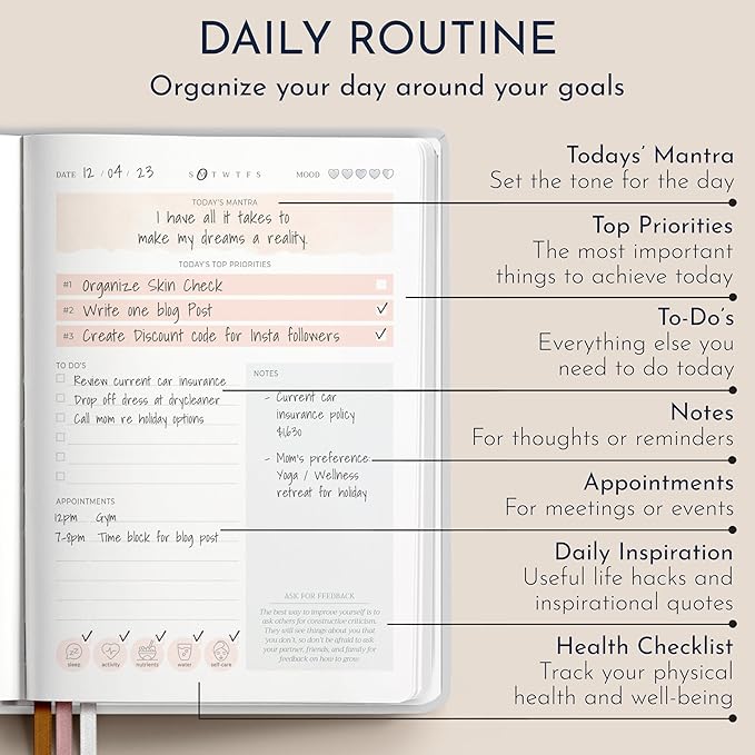 - Structure Meets Inspiration – Each day presents a new canvas, where your goals take shape through actionable plans. Infused with prompts for reflection and affirmations, this journal doesn’t just organize your tasks—it elevates your entire mindset, keeping you aligned and inspired on the path to personal triumph.