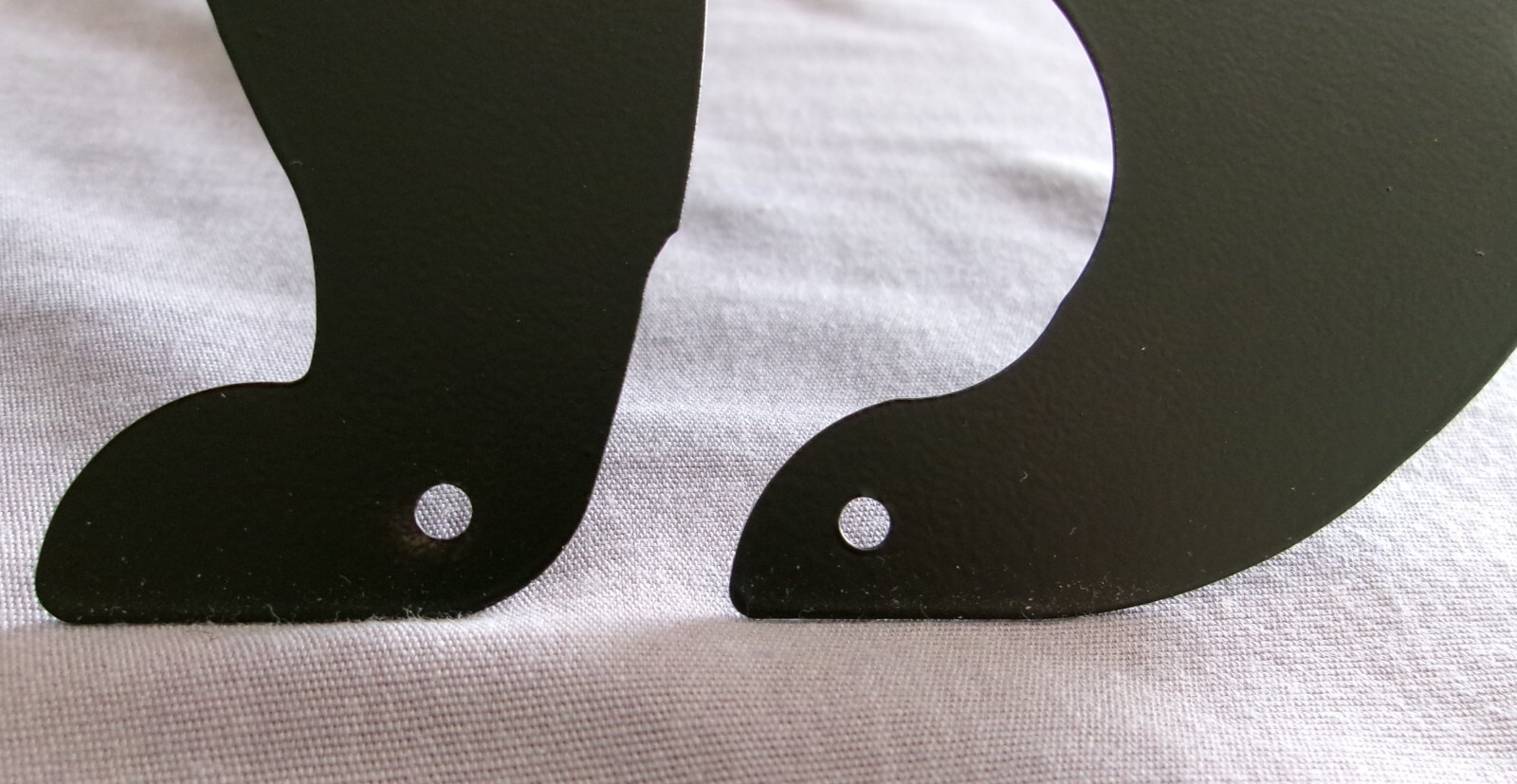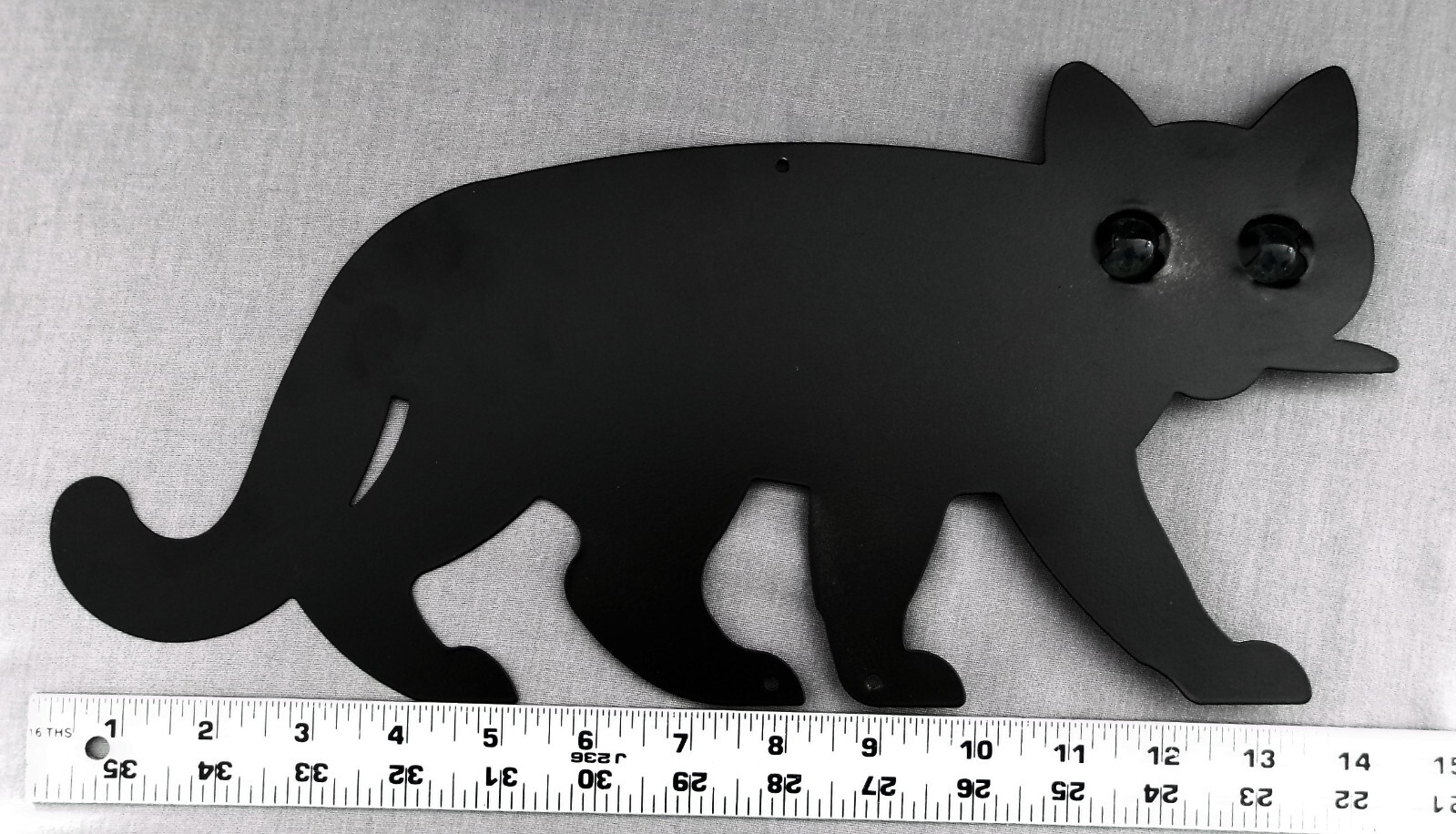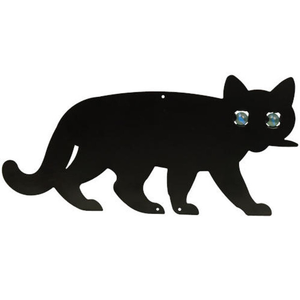 - The Scare Cat is a realistic feline shape with reflective glass eyes on a painted black metal body.