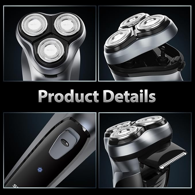 - 3D FLOATING SHAVING HEAD: This men’s electric razor adopts 54 self-sharpening blades and 0.11mm ultra-thin hypoallergenic stainless steel double cutter net, which greatly increases the contact area between the knife net and the face, and doubles the shaving efficiency and without any residue.The 3 sets 4D floating heads can form a Ergonomic V-Track shaving angle of 152 degree max when pressing over face, 360°fit skin contour.
