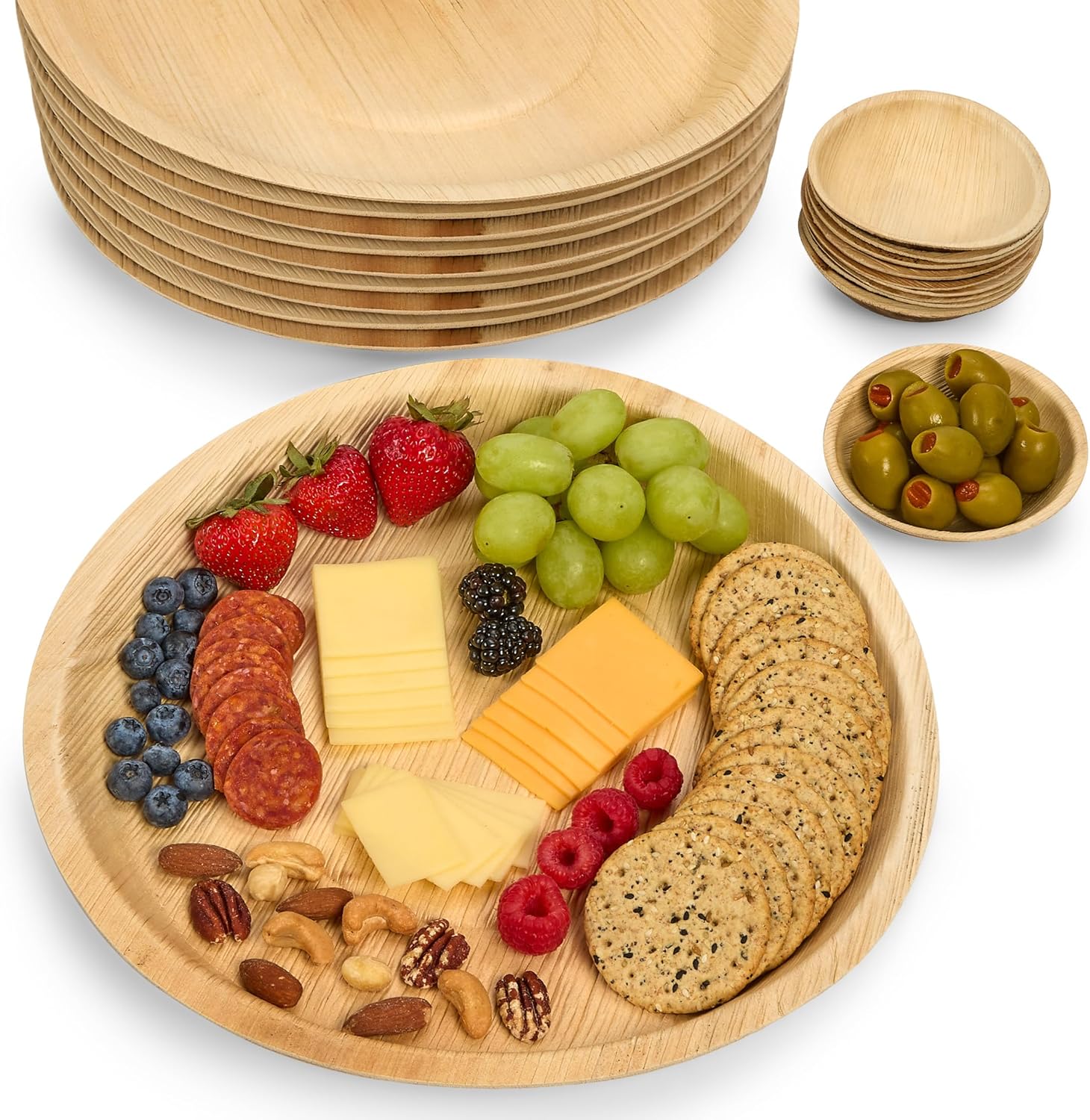 Set of 10 – 12″ Round Disposable Charcuterie Boards – Palm Leaf Platters with Small Dip Bowls – Item #7503