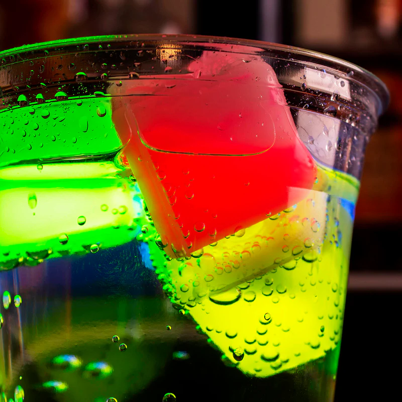 - These plastic ice cubes are a fun and simple way to excite your guests at your next party. These cubes are one time use and can glow up to 10+ hours. Simply press in the button on the bottom of the cubes against a hard surface and shake them up and watch them glow. Comes in assorted colors.
