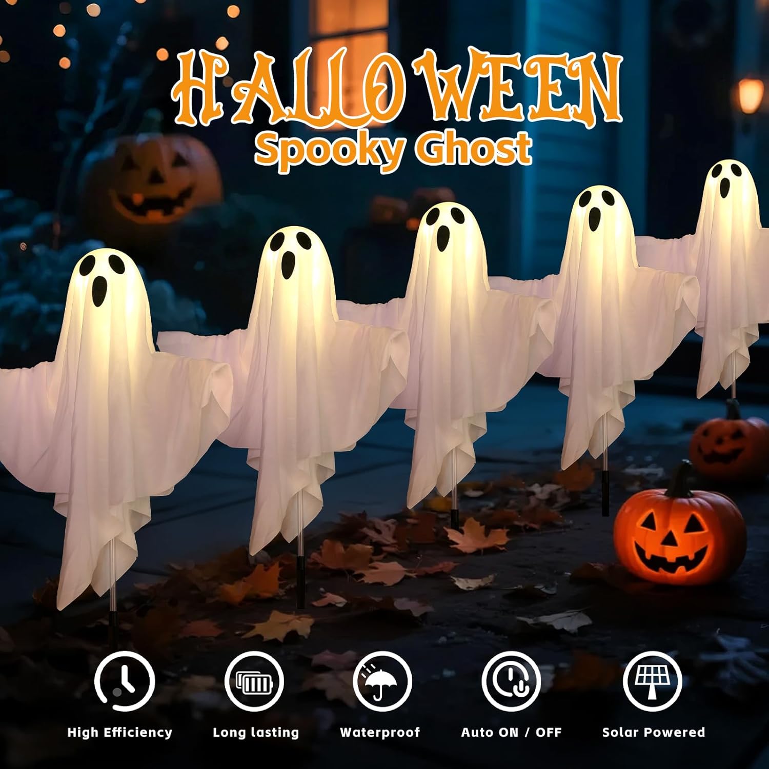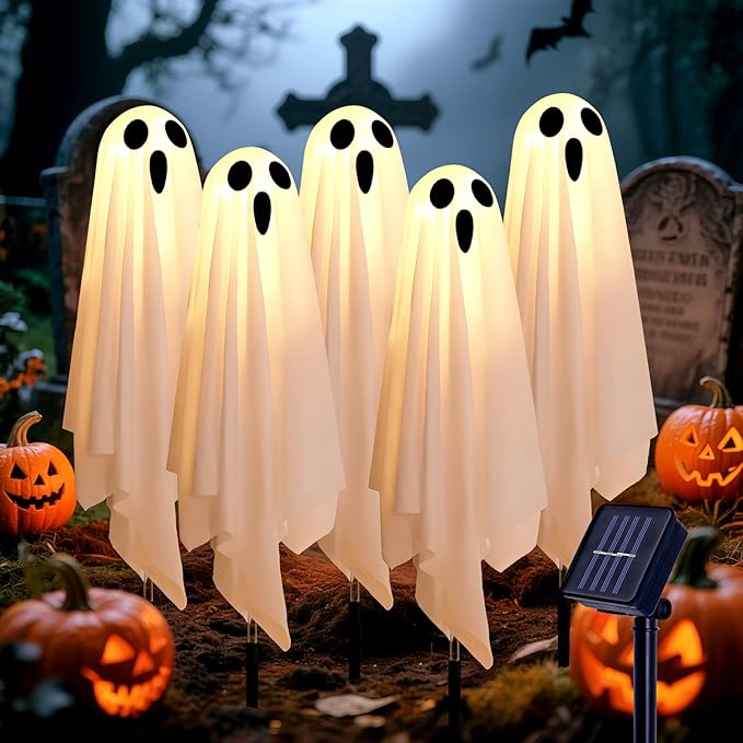 Set of 5 – Solar Halloween Ghost Lights – Outdoor Ground Stake Spooky Ghosts – Item #8895