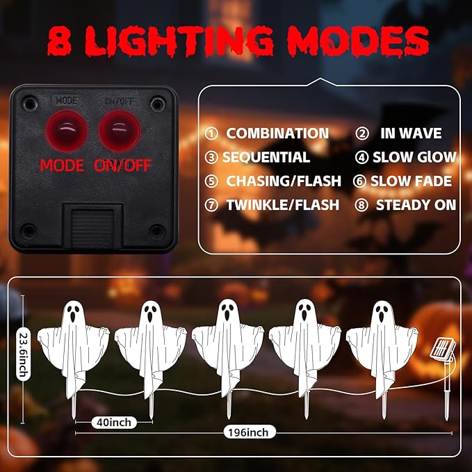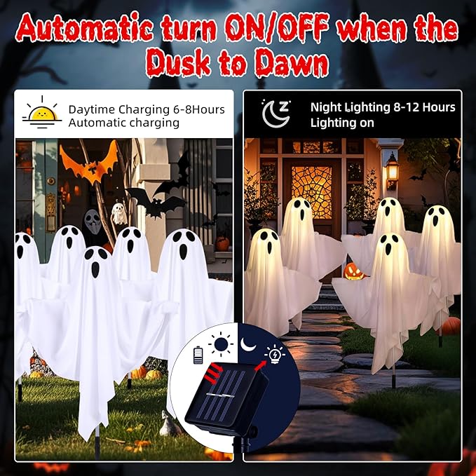 - 8 Flash Modes: The ghost kit has bendable high-brightness LED lamp beads, 50 LED lamp beads. ( Solar panel battery (1.2V/600mAH), charging 6-8 hours, discharging 8-12 hours)