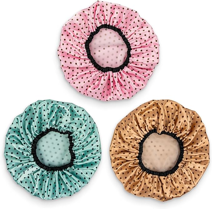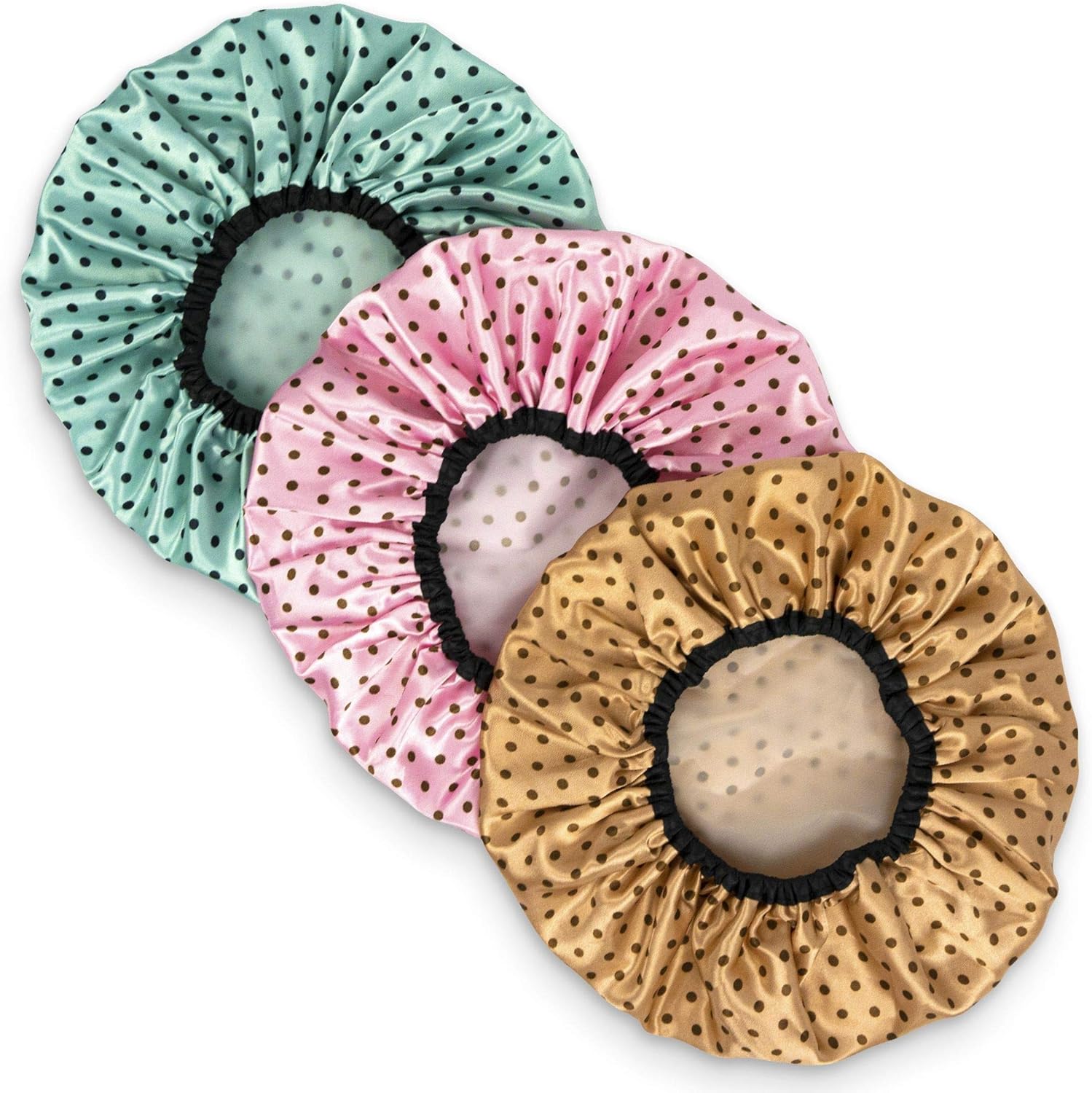 Shower Cap Set – 3 Pack – Pink, Green, Brown – Polka Dots – Item #8247