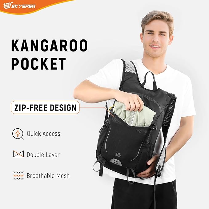 - Breathable Dual-Layer Kangaroo Pocket: The front-facing stretch mesh kangaroo pocket features dual-layer elastic breathable fabric, designed to securely hold damp gear, sweaty shirts, or small essentials like snacks and maps. Its stretchy, ventilated design allows quick retrieval while maintaining airflow to prevent odor buildup—perfect for on-the-go adventures