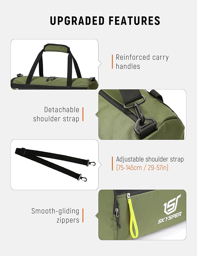 - Adjustable Shoulder Strap: SKYSPER duffle bag gym has a detachable shoulder straps that can be adjusted and locked to the length you need to achieve a comfortable carry experience and reduce pressure.