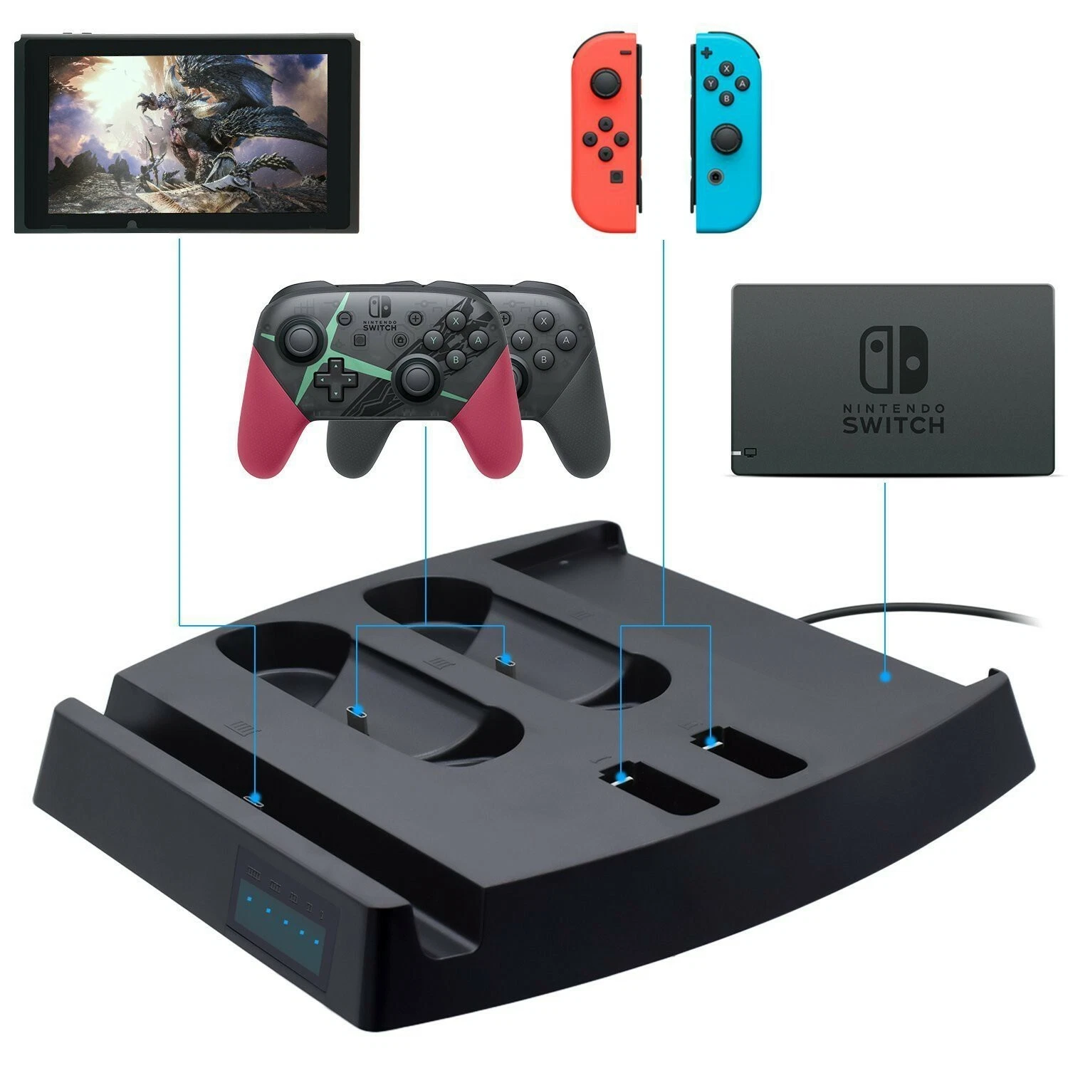 Perfect for storing, displaying, and charging your Nintendo Switch base, controllers, and games.