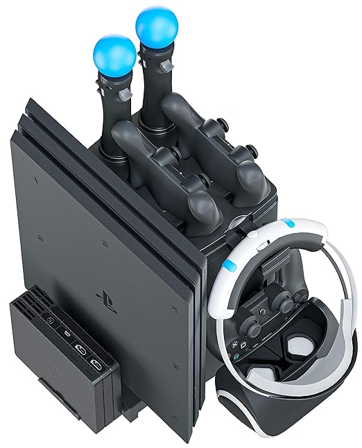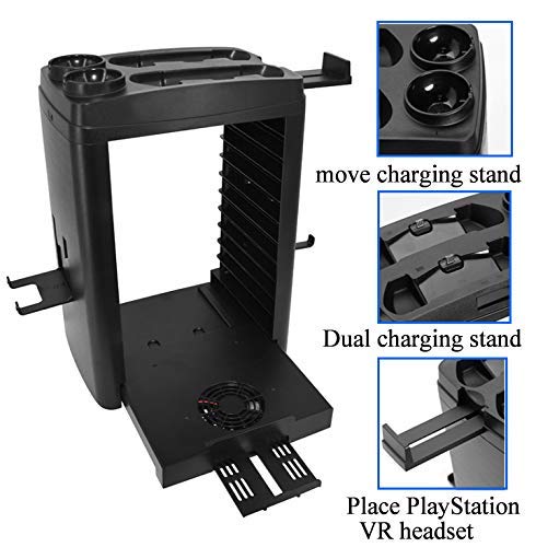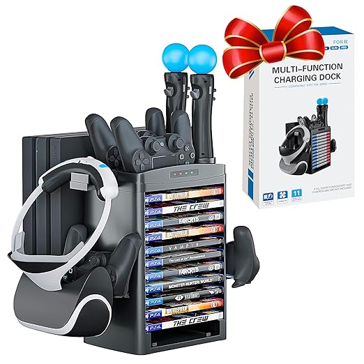 - Maximize Gaming Space with a Multi-Function Stand: Organize your gaming setup with this all-in-one headset and controller stand ps4, featuring a built-in game disc rack, USB hub, controller chargers, cooling fan, and vertical stand, making it the ultimate space-saving solution for your console, headphones, and PSVR (supports both PSVR V1 and V2).