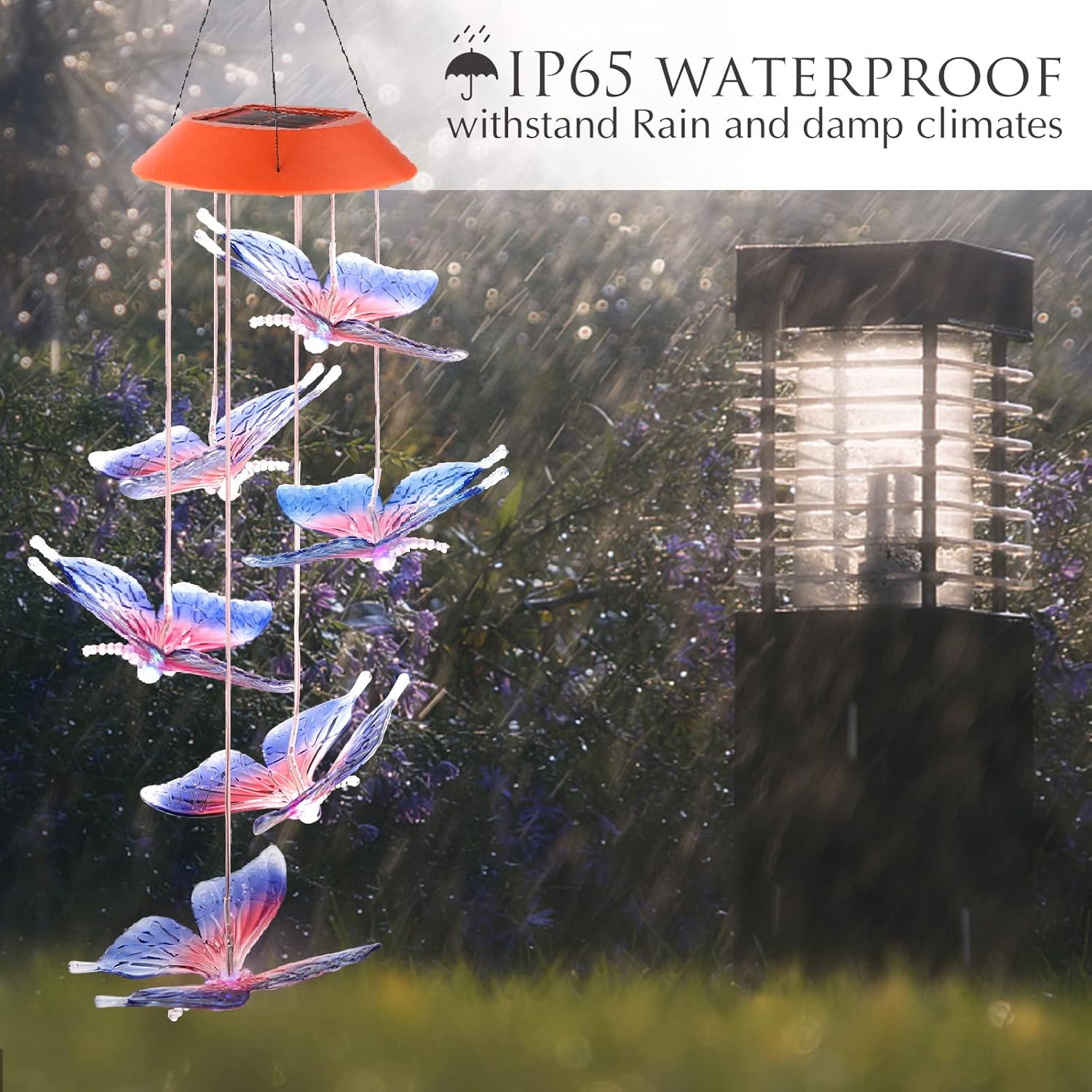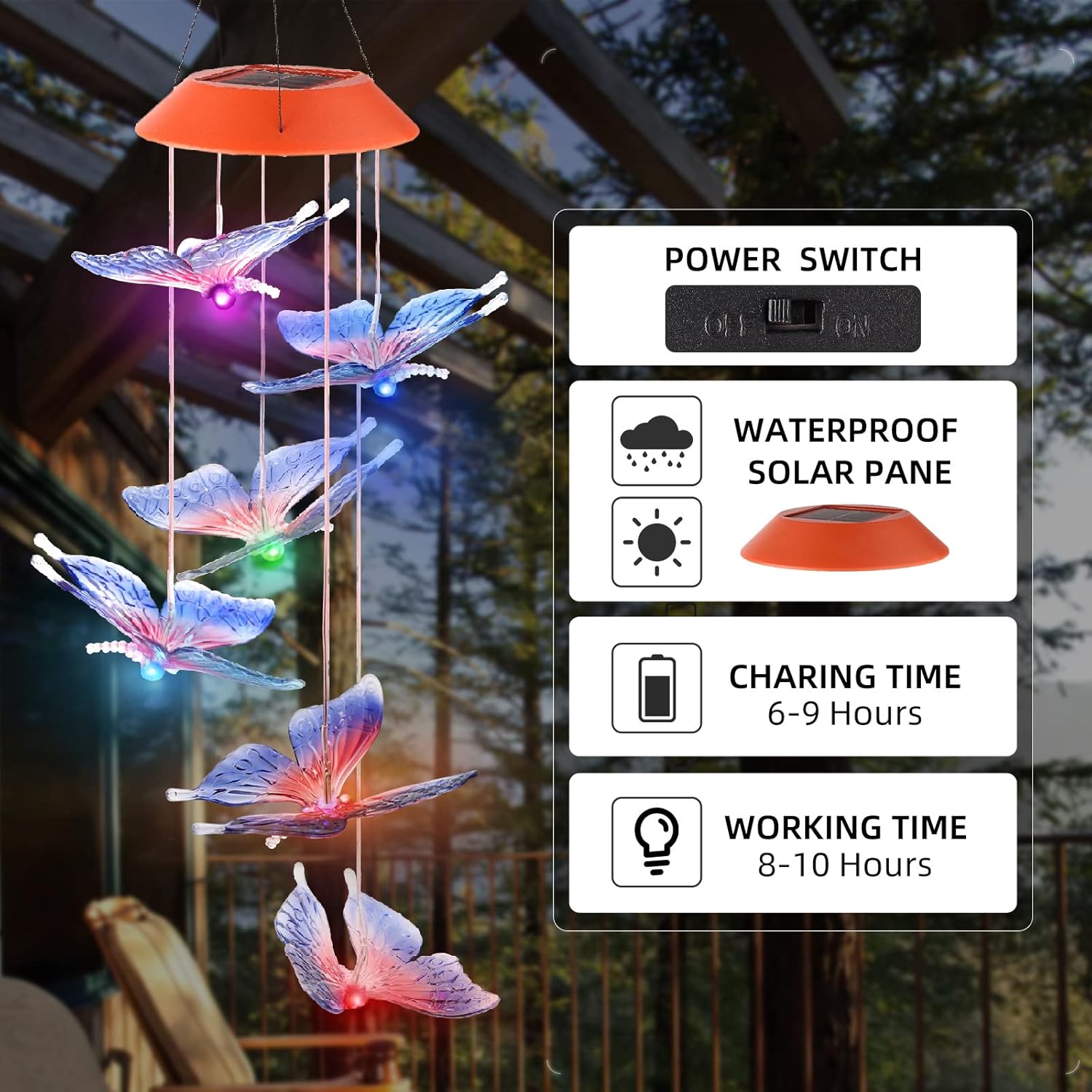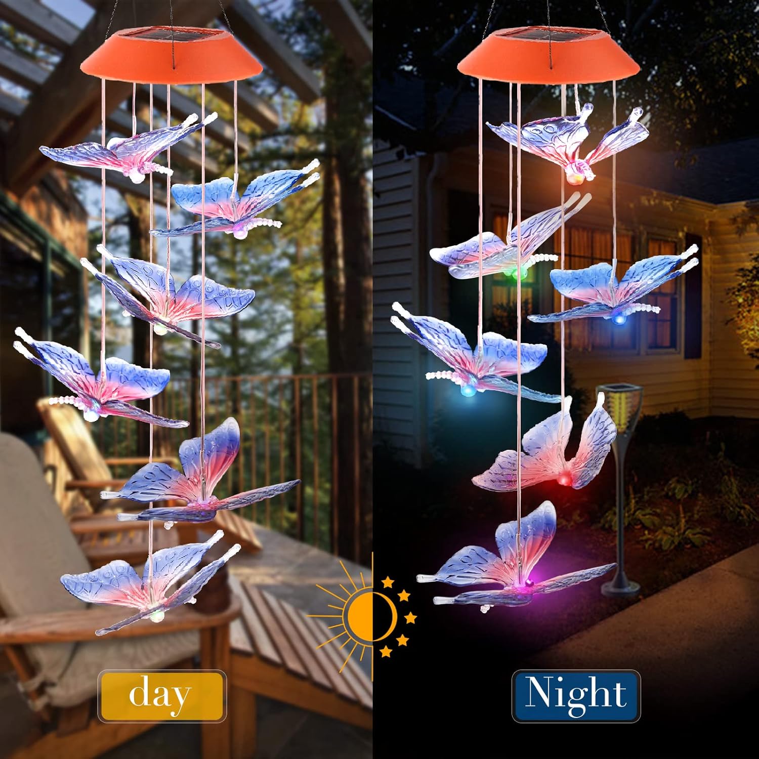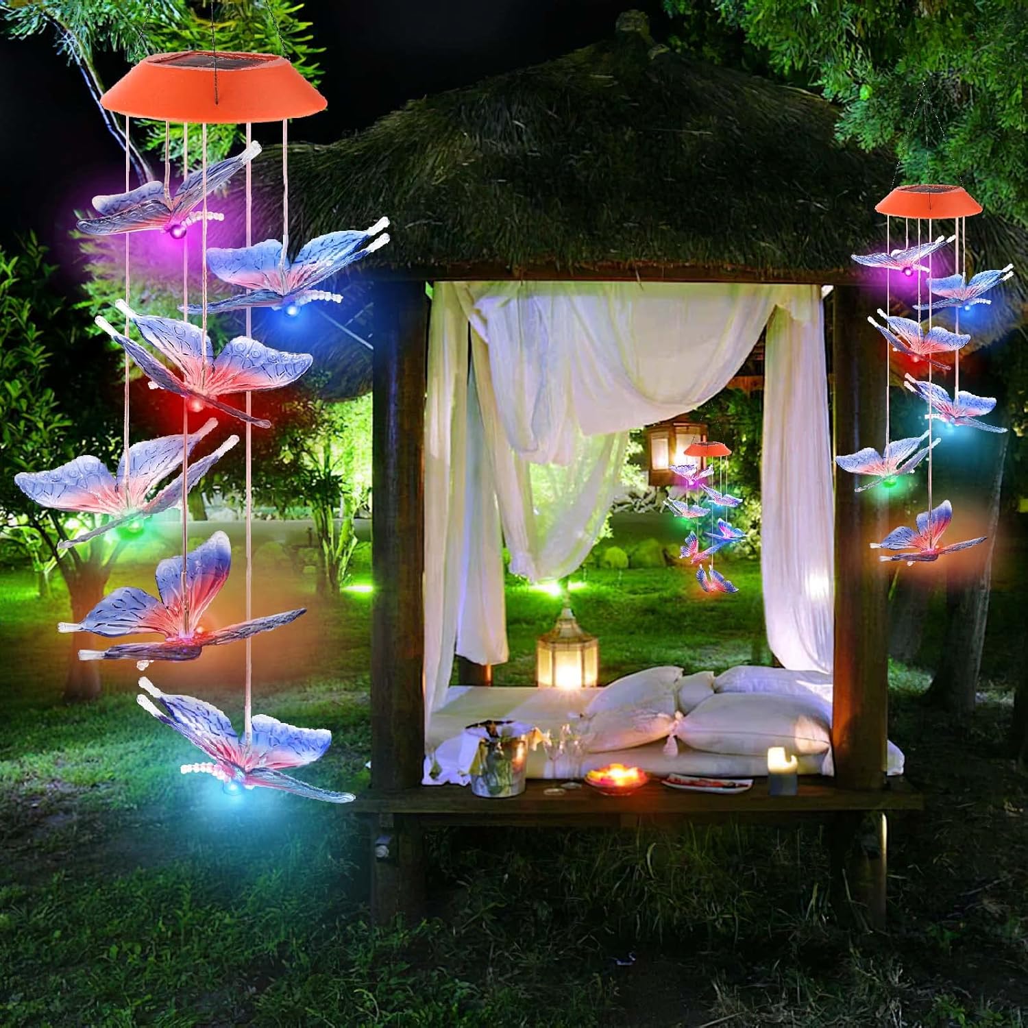 Transform your garden or patio into a magical oasis with these solar-powered butterfly wind chimes. Featuring color-changing LED lights, they automatically illuminate at night for a stunning display-no wires or batteries needed!
