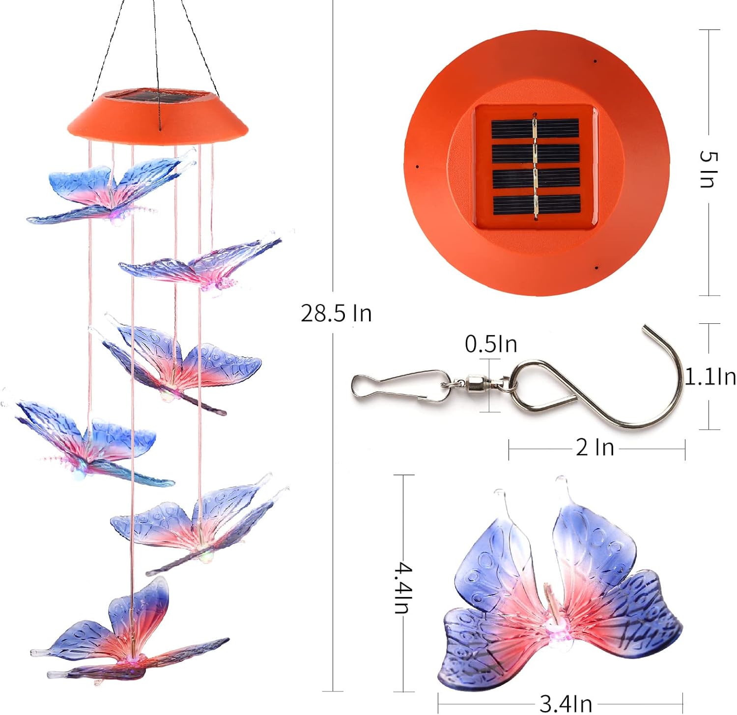 Bring a touch of charm and tranquility to your outdoor spaces with our Colorful Butterfly Solar Wind Chimes. Powered by the sun, these enchanting mobile features six LED-lit butterflies that change colors gently at night, creating a romantic and peaceful ambiance for your garden, patio, balcony, or living space.