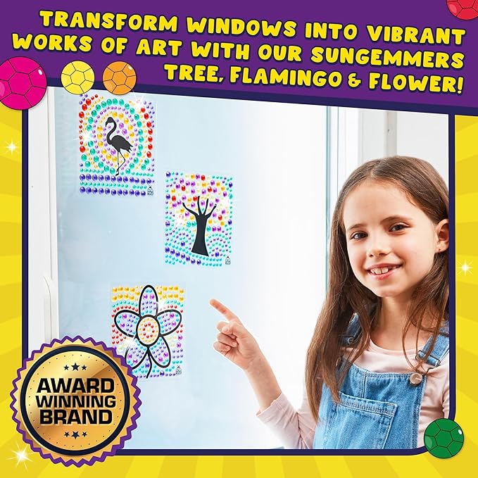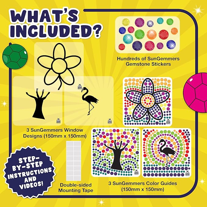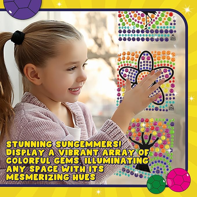 • Complete craft kit to create your own unique sparkly window art right away! Includes 3 pre-printed window designs, 3 color guides, over 1000 SunGemmer gemstone suncatching stickers, a double sided mounting tape, plus full instructions.