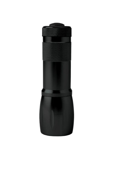 1″ x 4″ torch-style flashlight with aluminum construction, nine LED bulbs, hand strap and push-button light