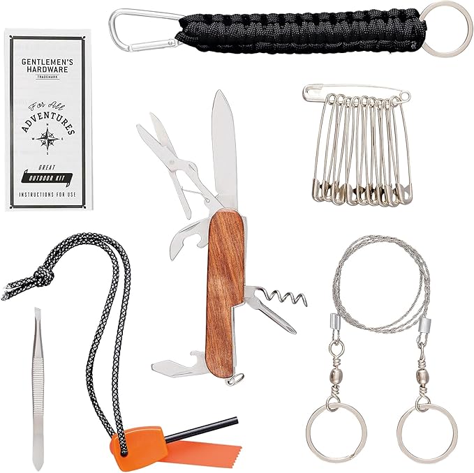 - THIS SURVIVAL KIT INCLUDES: (1) fire starter, (1) 6-in-1 pen knife (w/ a knife, scissors, corkscrew, (2) can openers, & a Phillips screwdriver), (1) pair of tweezers, (1) 82″ woven rope, (1) wire saw, & (10) safety pins