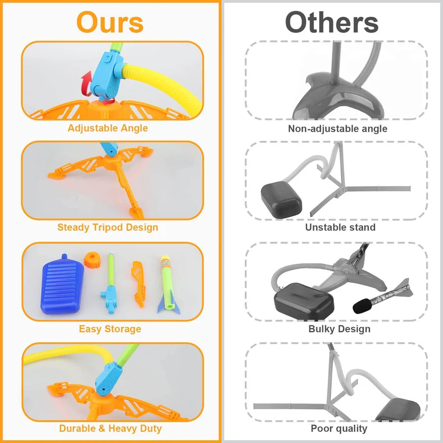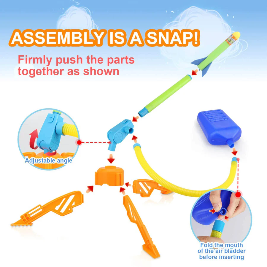 - EASY ASSEMBLY AND COMPACT STORAGE – This jump rocket toy has very few pieces. Snap it together for launching rockets and pull it apart when done for easy storage. The rocket toy is equipped with an air bladder launcher and tripod stand connected by a simple but durable hose. With its child-friendly design, your kids can easily assemble or store their fun toy rockets. No the perfect no batteries required toy for 3 4 5 6 7 8+ year olds.