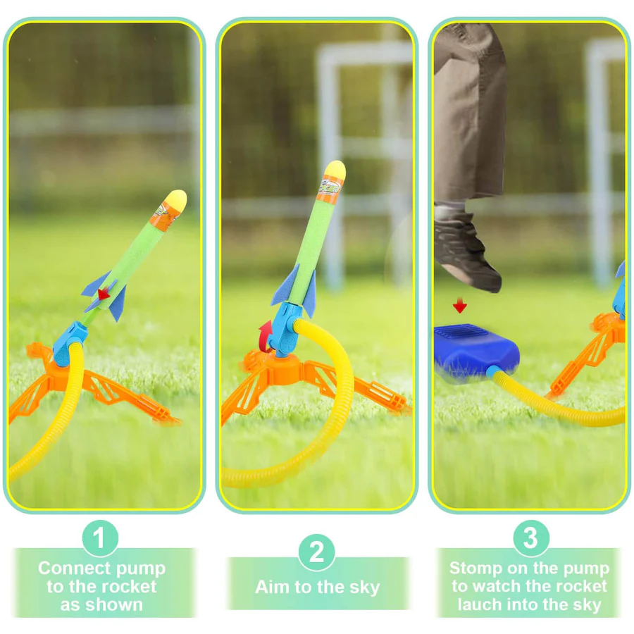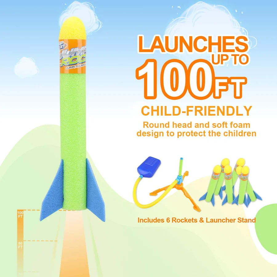 - SHOOTS UP TO 100 FT – Run, Jump and STOMP to launch your rocket up to 100 feet in the sky. The ultimate park and backyard toys are backyard friendly and safe. They won’t go so far that kids lose track of them, but shoot far enough to have fun. Set up a target and make a game of it! The best rocket toys for kids 3-5.
