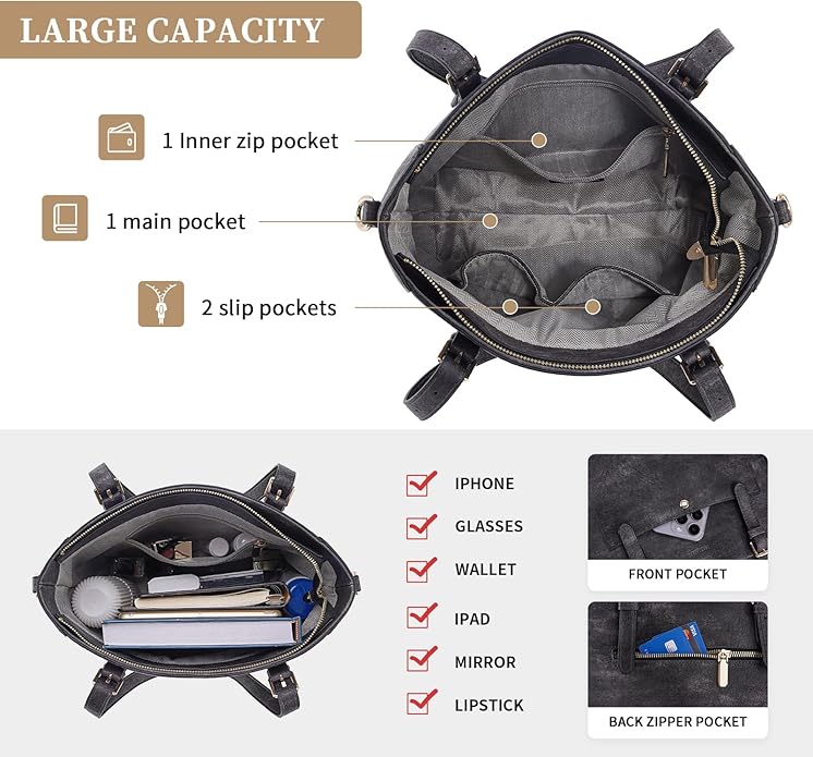 - TOTE BAG POCKET STRUCTURE: This tote bag for women features a top zipper closure. The interior pocket includes 2 slot pockets and 1 zippered pocket to help organize your daily essentials. External pockets include 1 back zip pocket and 1 magnetic buckle front pocket, providing quick access and ensuring the safety of your belongings
