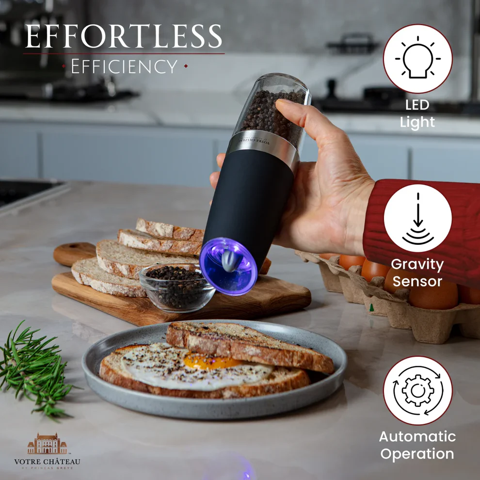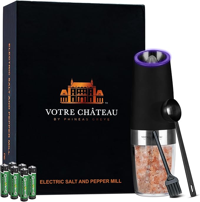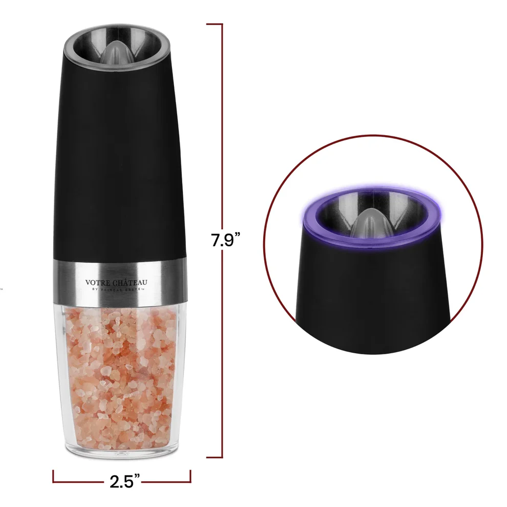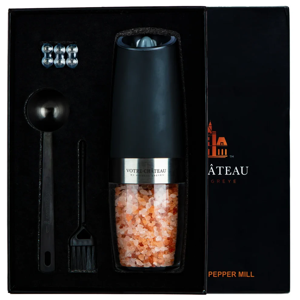 Votre Château by Phineas Greye Gravity Electric Grider – Batteries Included – Spice Scoop – Cleaning Brush – Black – Item #7781