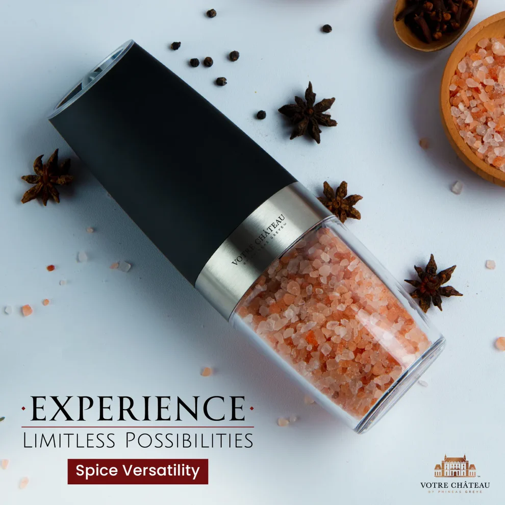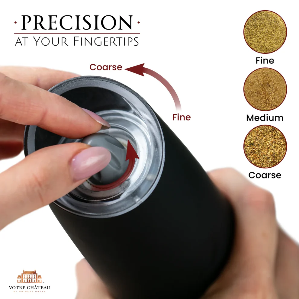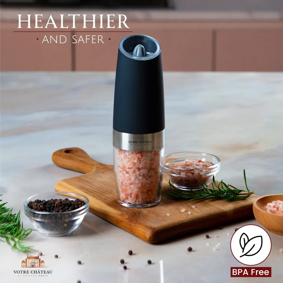Votre Château by Phineas Greye Gravity Electric Grider – Batteries Included – Spice Scoop – Cleaning Brush – Black – Item #7781