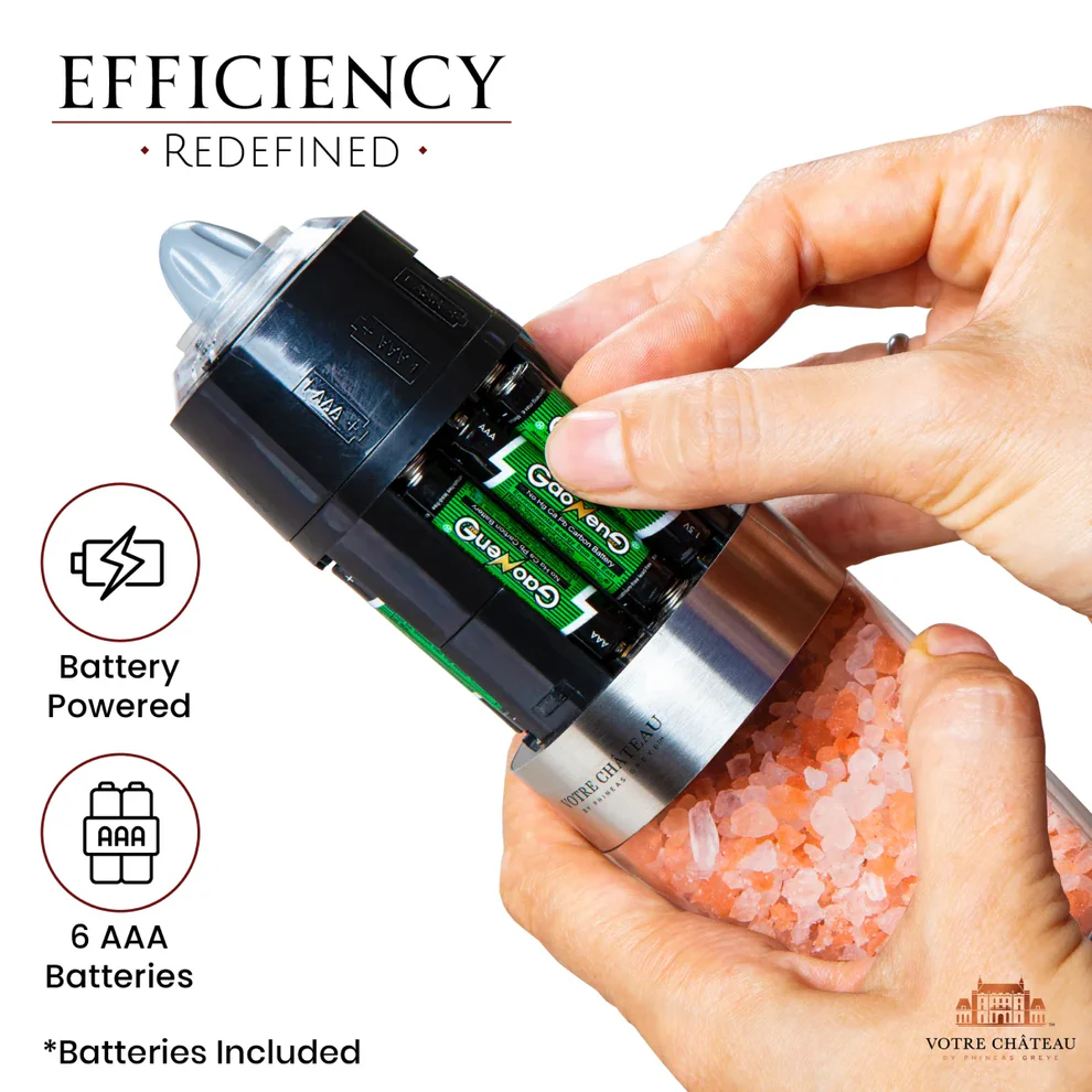 • Batteries Included for Immediate Use – Our salt or pepper grinder set comes with batteries, so you can start seasoning your meals right out of the box.