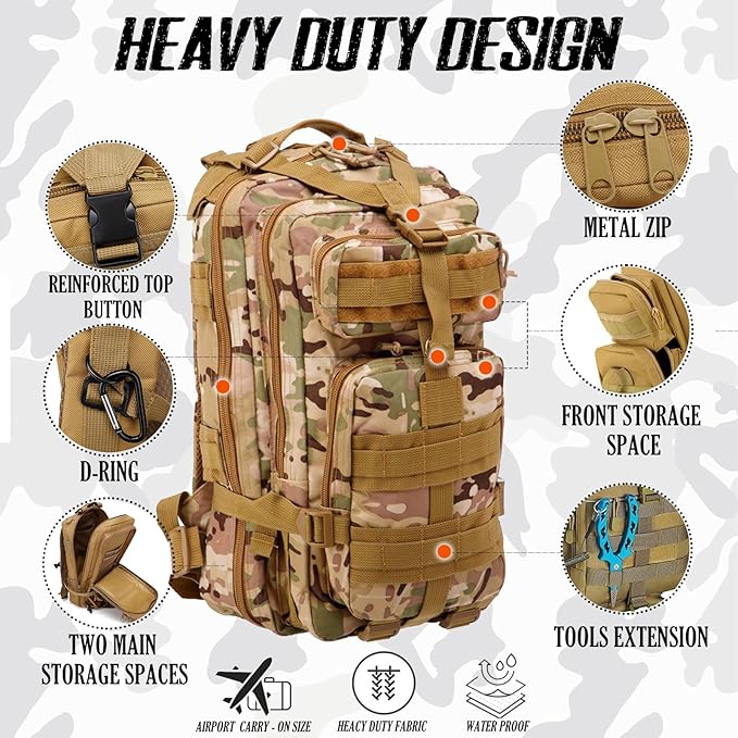 - The Backpack is perfect for people who prefer a compact and lightweight option. It offers ample space to store essential gear and supplies while maintaining a streamlined and agile profile. The 26L capacity is ideal for day hunts, camping, hiking etc. (Size: 10.63” x 9.06” x 17.72′)